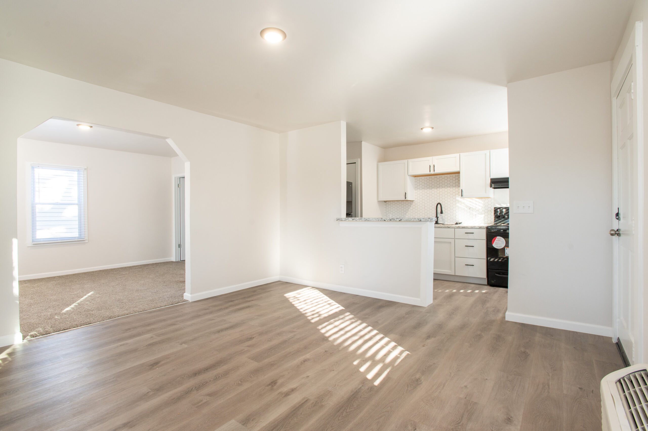This spacious one-bedroom duplex features wood-like flooring and carpeted bedroom area as well as appliances, granite countertops, and a one-car garage!
